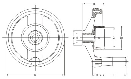 JS.105006 雙輻表盤手輪 顏色:黑色 材質:酚醛樹脂(膠木)、鋁合金 用途:適用于木工、食品、包裝、印刷等機械的精密指示或讀數調節(jié) 特性:外形美觀、堅固耐用、機械式結構、