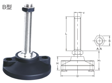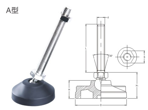 JS.108007 關(guān)節(jié)蹄腳 顏色:黑色 材質(zhì):增強尼龍、碳鋼 用途:適用于小型設(shè)備的水平調(diào)整及減震